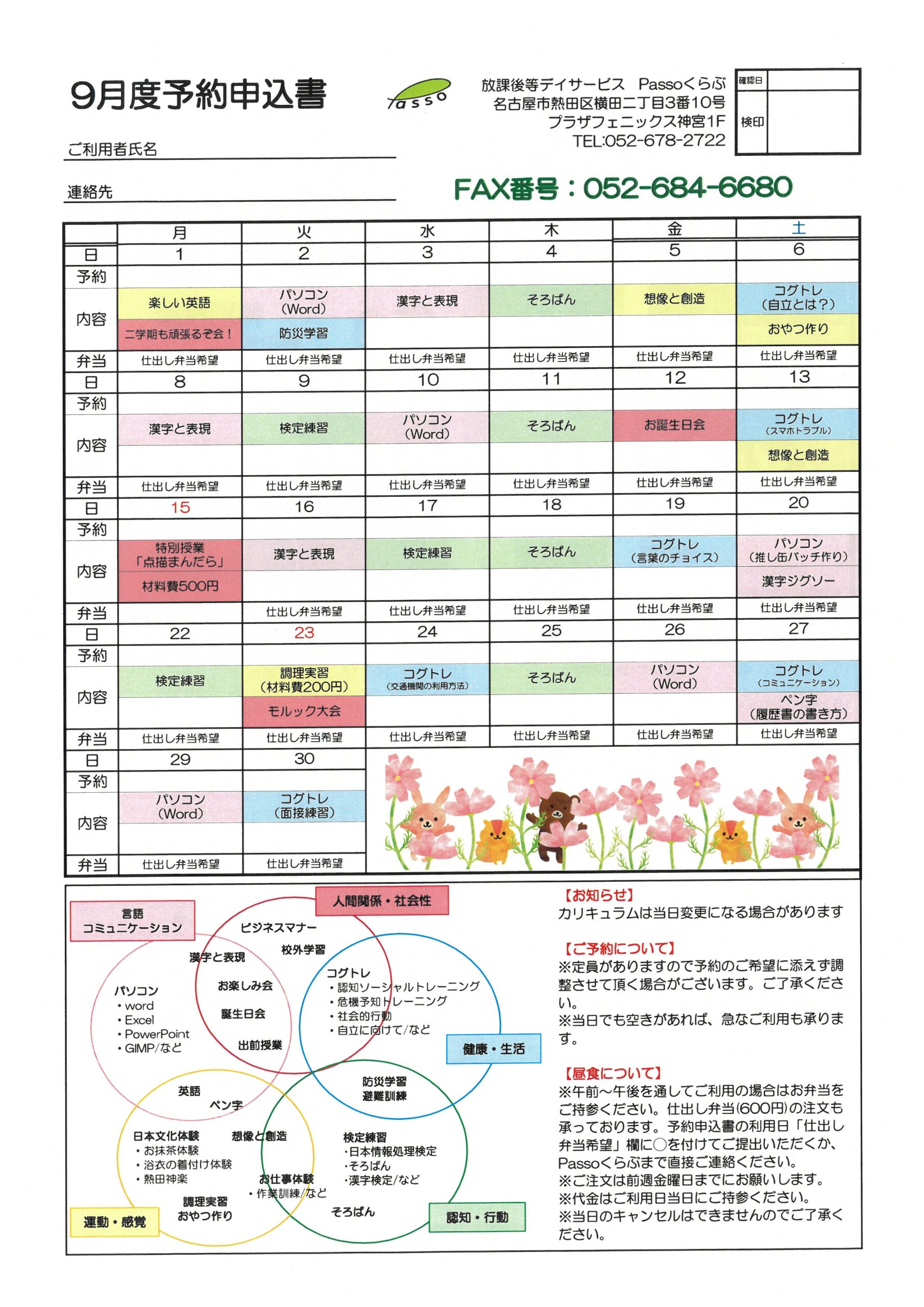 Passoくらぶ熱田の9月度カリキュラムです。